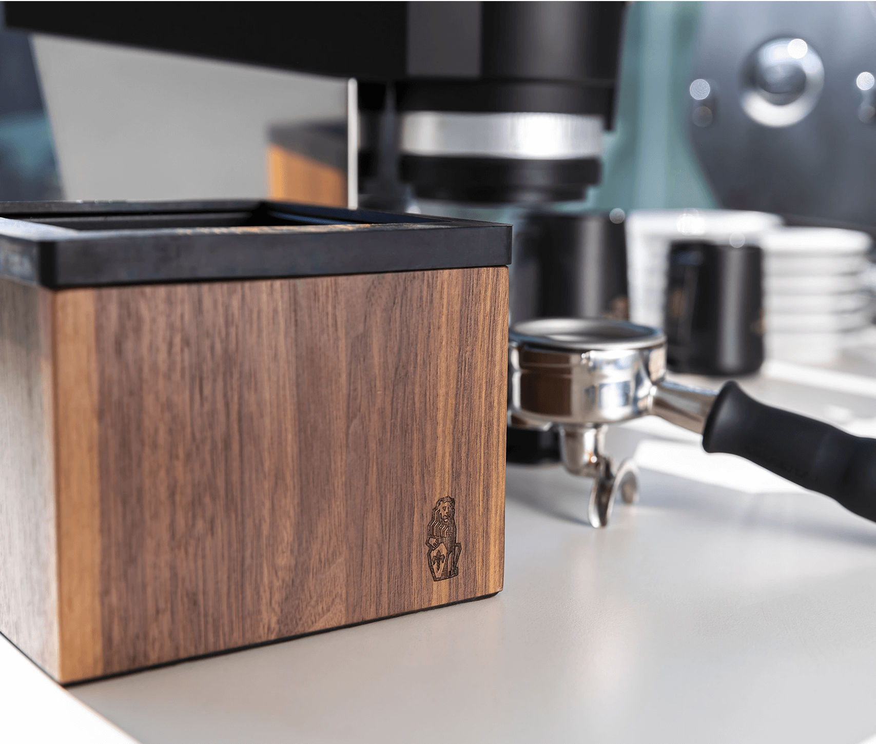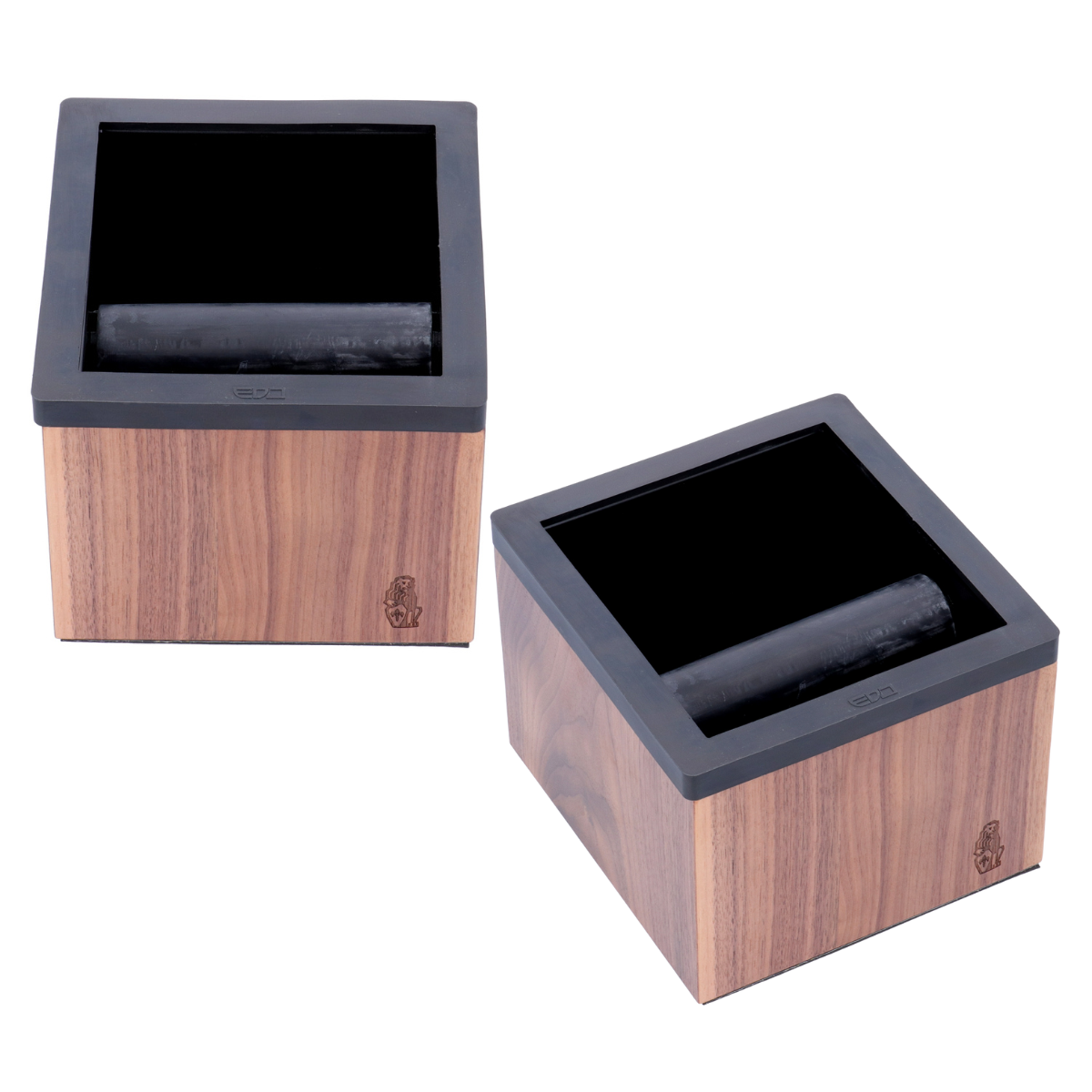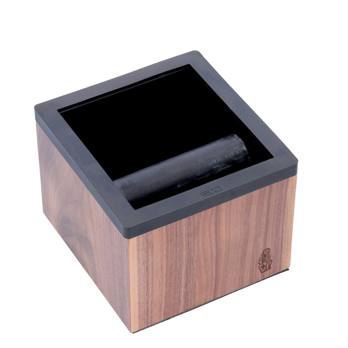 Elegant knock box i valnøtt for å holde benkeplaten ren. Holdbar og vakkert designet med treinnsats og stålkjerne. Perfekt for enhver kaffeentusiast.