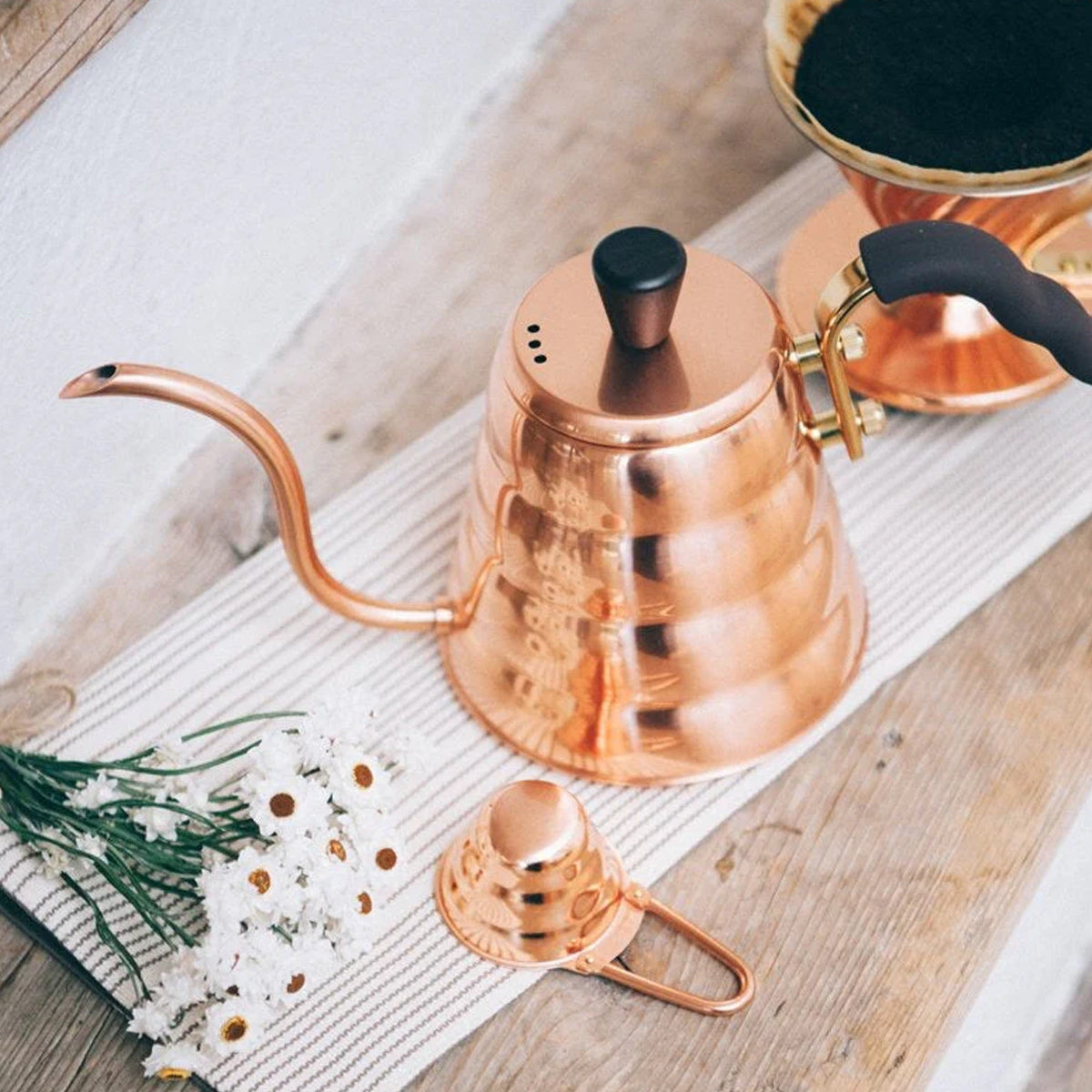 Buono-kjelen i flott kobberutgave er perfekt for pour over kaffe. Med sin forbedrede svanehals og ergonomiske håndtak gir den optimale bryggeforhold. Kjelen har en kapasitet på 0,9L og kan brukes på gass og elektrisk, men ikke på induksjon.
