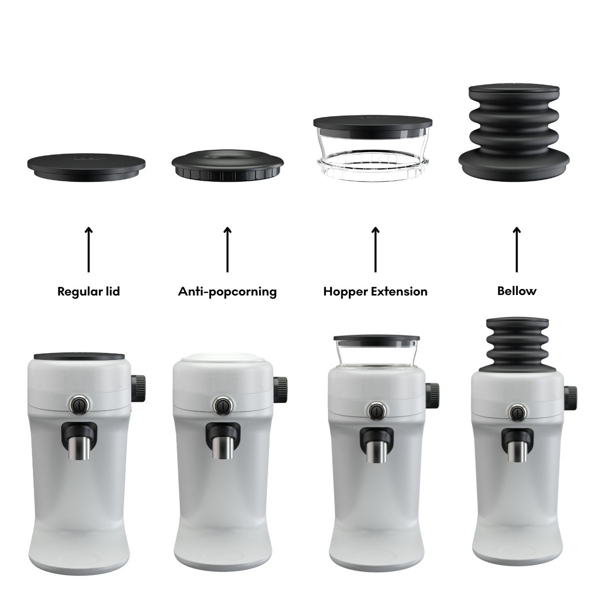 • Hopper-lock – minskar popcorning (att de sista bönorna hoppar upp när de träffar kvarnen) och rymmer 100 g bönor